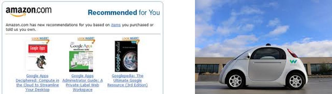 For example, no one has programmed our tastes into the Amazon recommendation system; a learning algorithm figured them out on its own, by generalizing from our past purchases. Google’s self-driving car taught itself to stay on the road; no engineer wrote an algorithm instructing it step-by-step, how to get from A to B. No one knows how to program a car to drive, and no one needs to, because a car is equipped with a learning algorithm picks it up by observing what the driver does.